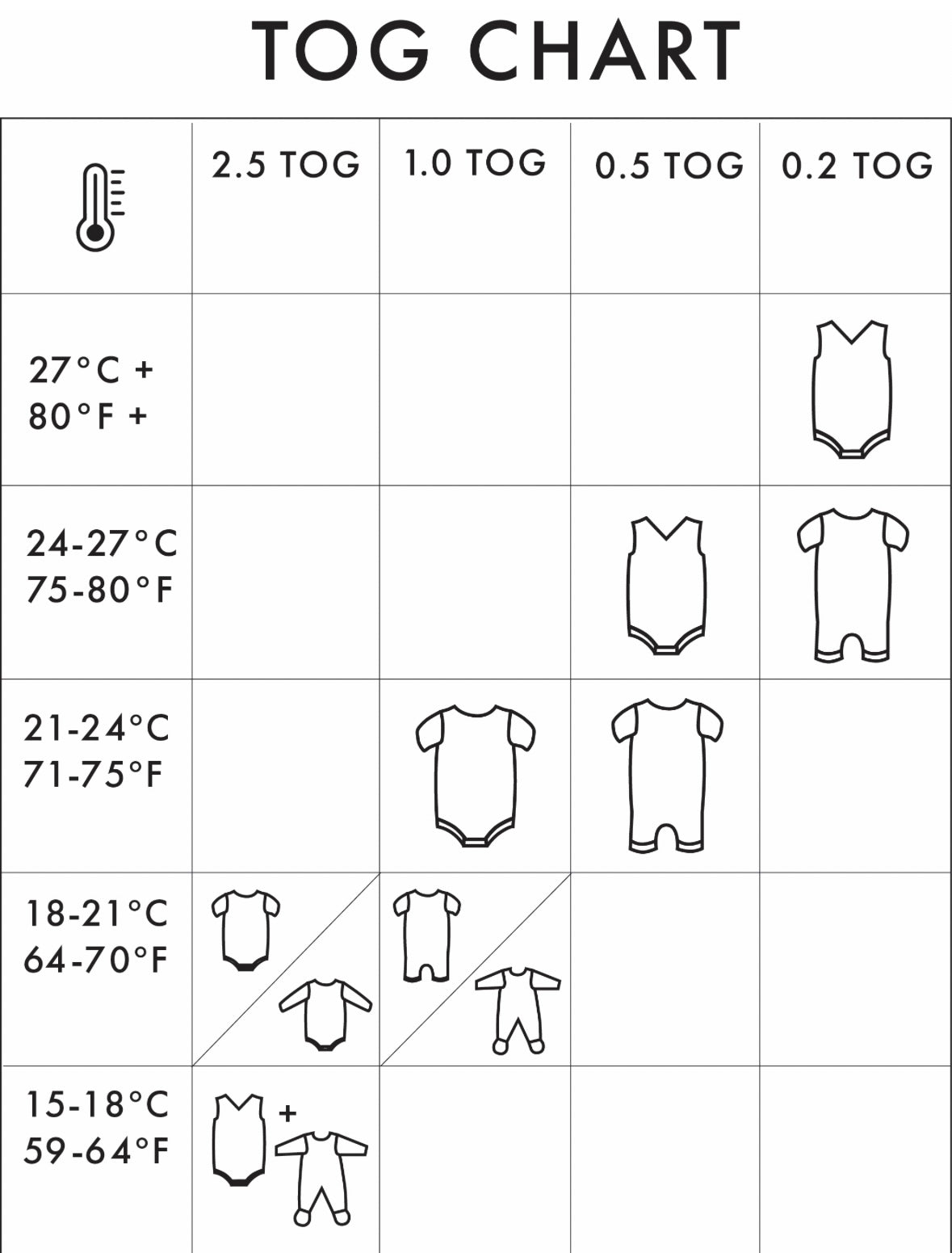 TOG - 0.5 - rekomenduojama vieno sluoksnio drabužia kūdikiui esant 21-24 laipsnio temperatūros kambaryje.
